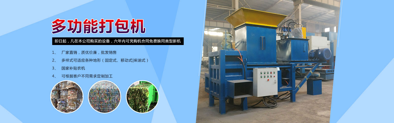 2、主營產品有農機設備,打包機,廢舊金屬處理設備,木材處理設備 ,先后出口到英國、俄羅斯、瑞典、馬來西亞、越南等30多個國家和地區